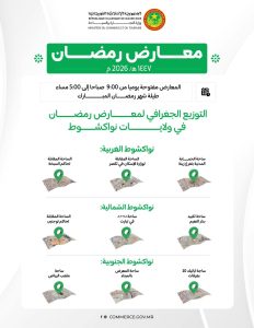 تنفيذاً لتعليمات رئيس الجمهورية محمد ولد الشيخ الغزواني، تفتتح وزارة التجارة والسياحة تسعة معارض رمضانية كبرى لبيع المواد الغذائية بأسعار مخفَّضة في ولايات نواكشوط الثلاث، وذلك طيلة شهر رمضان المبارك، في إطار دعم القدرة الشرائية للمواطنين وتوفير المواد الأساسية بأسعار مناسبة.